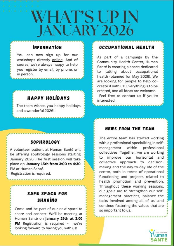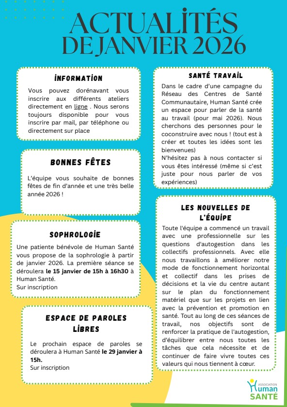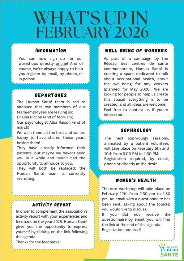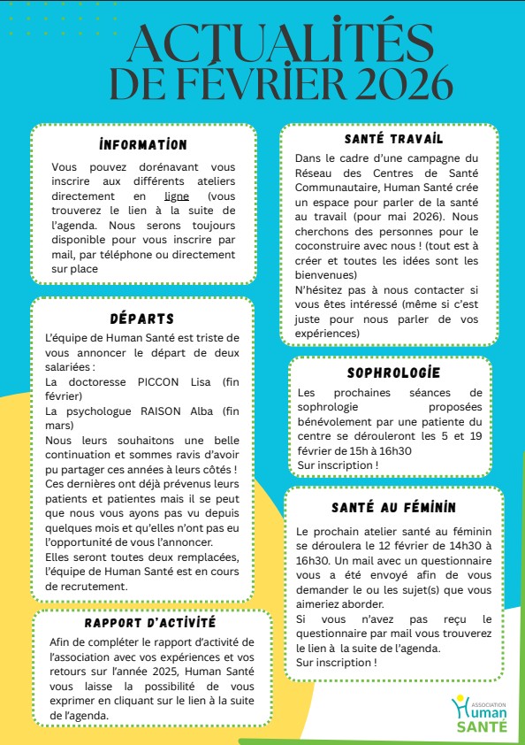 Pour toutes questions ou pour plus d’informations, n’hésitez pas à vous rendre sur le Facebook de Human Santé, de vous inscrire sur la mailing list en nous envoyant un mail à accueil@human-sante.org ou en nous appelant au 04 67 58 70 26.